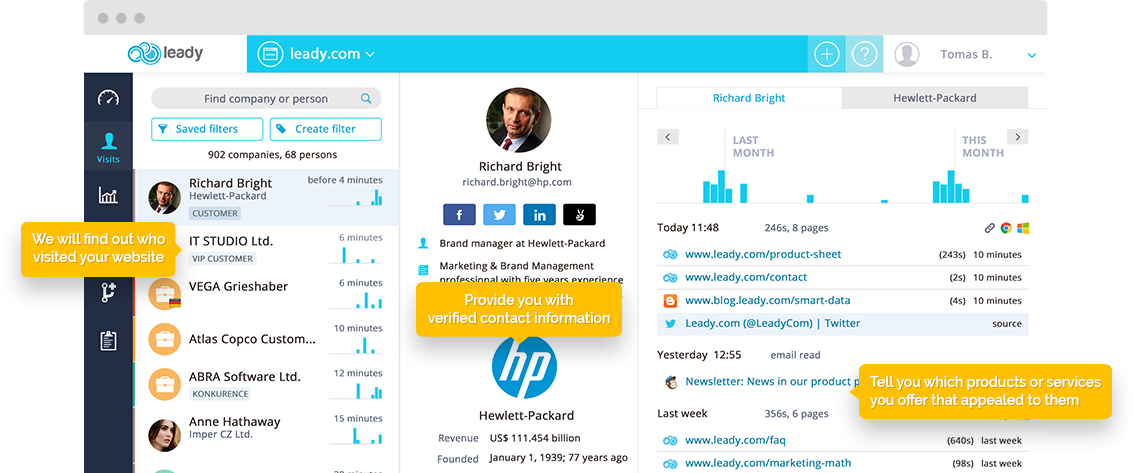 Leady turns your anonymous website visitors into business leads with full company and person profile.